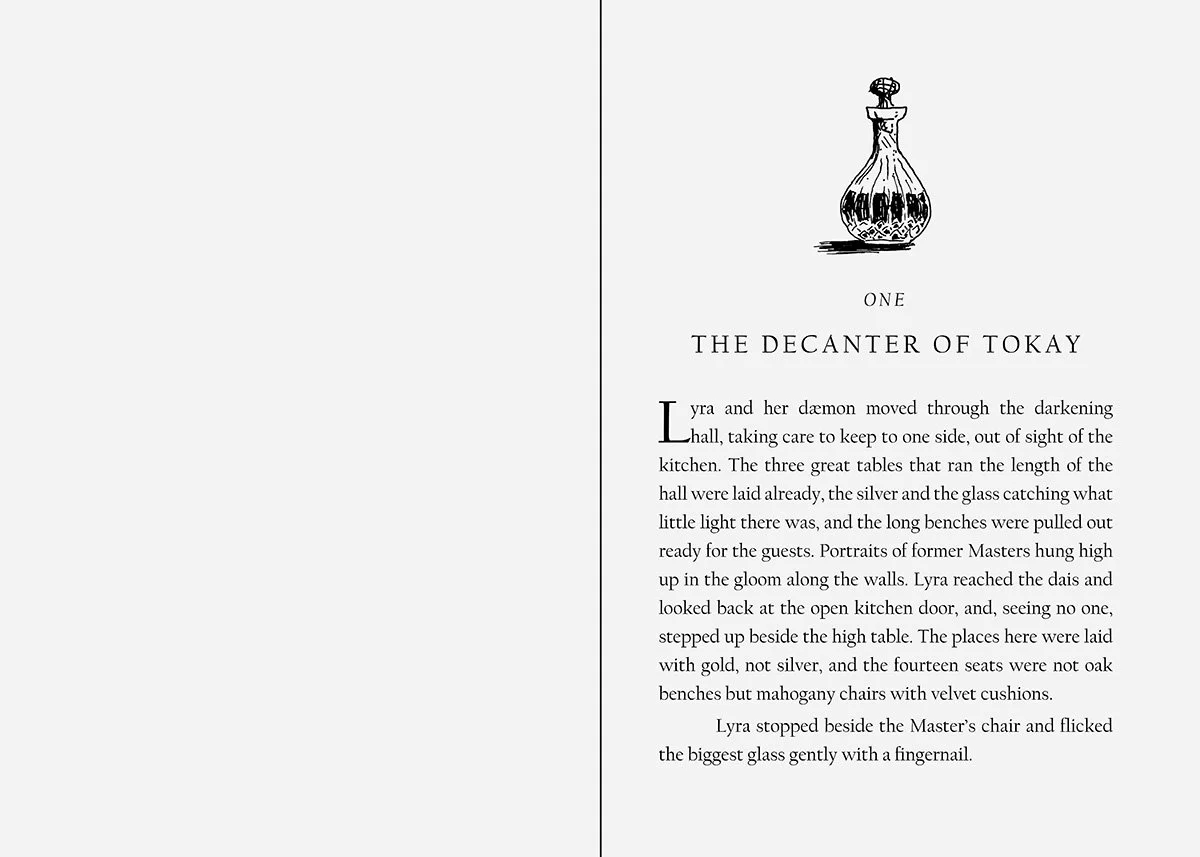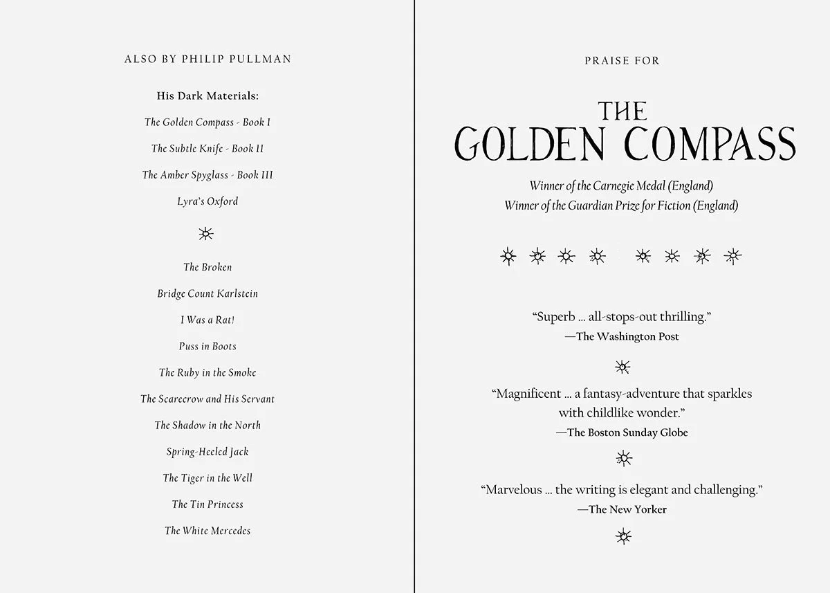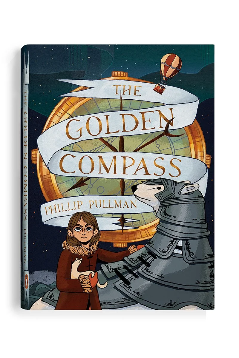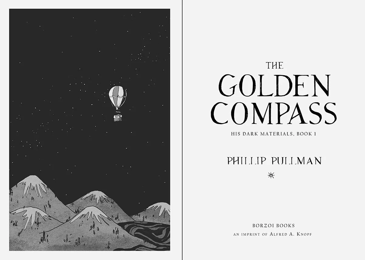 A cover and interior redesign for Phillip Pullman’s The Golden Compass, the first book of the His Dark Materials trilogy, including a jacket design, interior pages and illustrated chapter headers.