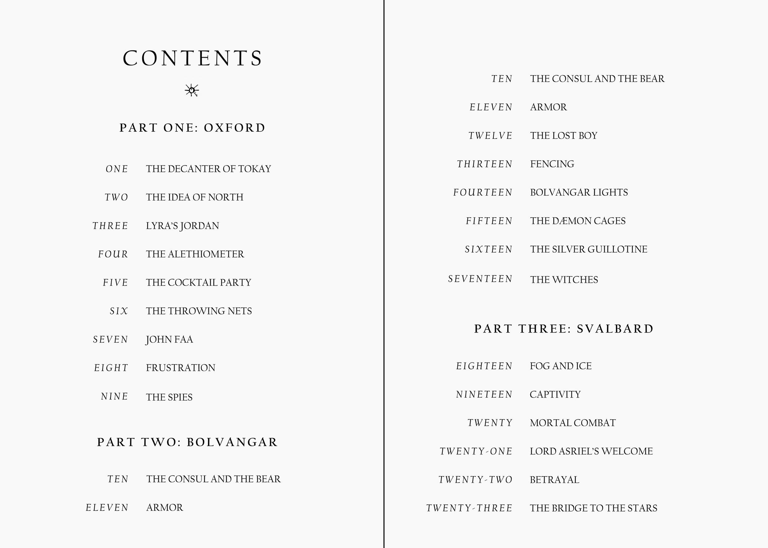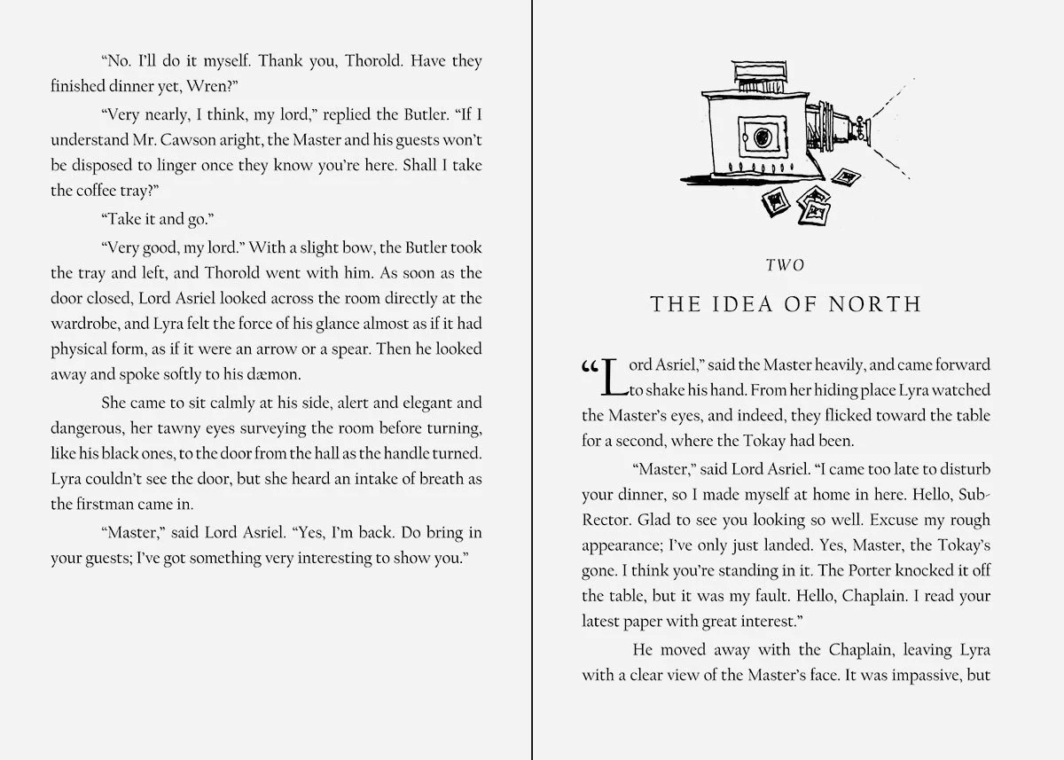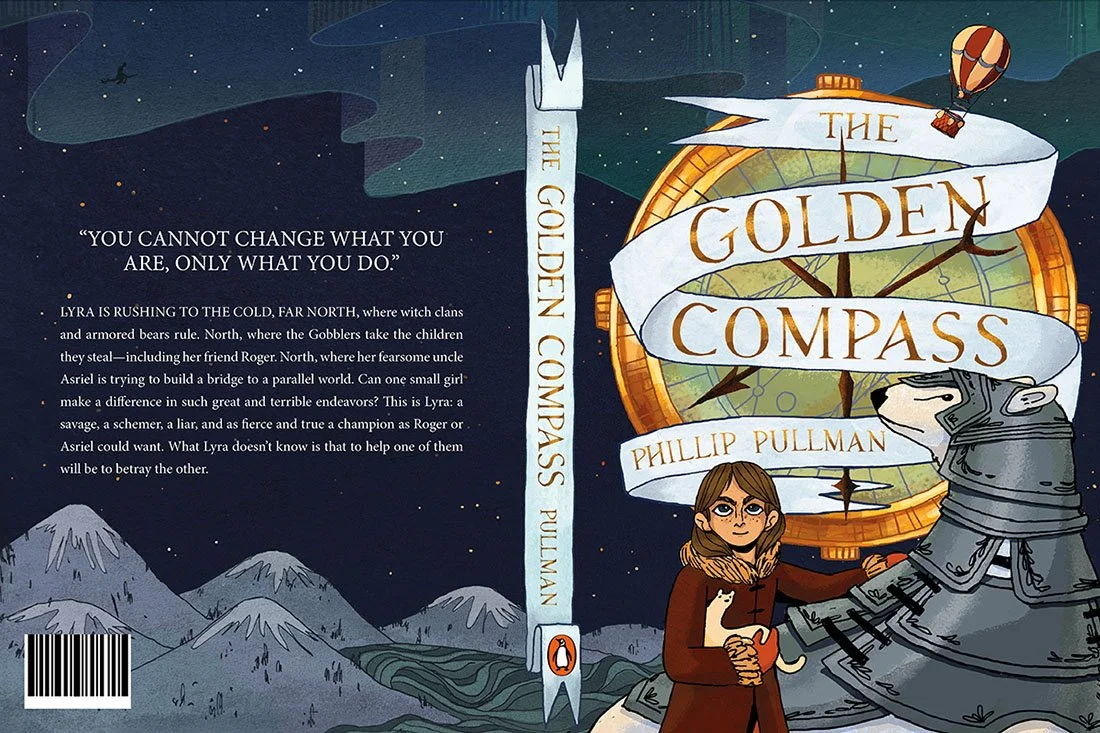 A cover and interior redesign for Phillip Pullman’s The Golden Compass, the first book of the His Dark Materials trilogy, including a jacket design, interior pages and illustrated chapter headers.